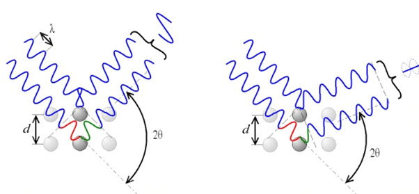 X선을 쏘아주는 각도인 θ 에 따라 파장이 서로 보강간섭을 하는지, 상쇄간섭을 하는지가 결정됩니다. 상쇄간섭을 일으키면 Detector에서 X선 관측이 되지 않을 것인데.