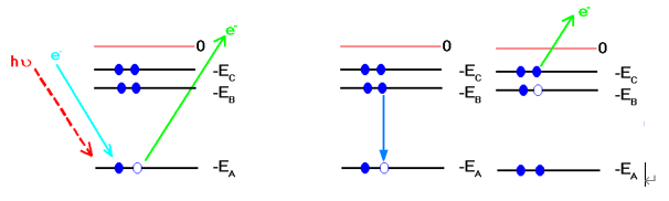 - Auger electron(오제 전자): X-ray나 X-ray에 의해 튀어나오는 전자가 때려서 나오는 전자, 혹은 원자에 가까운 전자가 튀어나가며 그 빈공간을 외각의 전자가 차지하고 그로 인한 에너지 방출에 의해 튀어나오는 전자