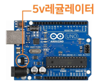 - 아두이노는 7-12V 어댑터를 연결하면 알아서 자체적으로 5, 3.3V로 낮춰서 구동됩니다. 전압 변환 역할을 해주는 것이 아래 그림의 레귤레이터 입니다.