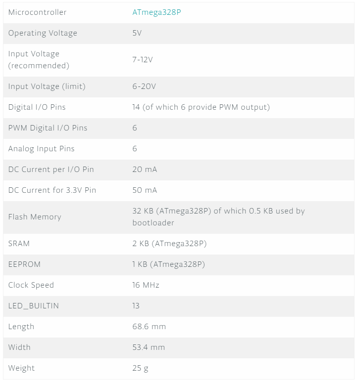 아두이노 사이트에서 가져온 제품 사양입니다.