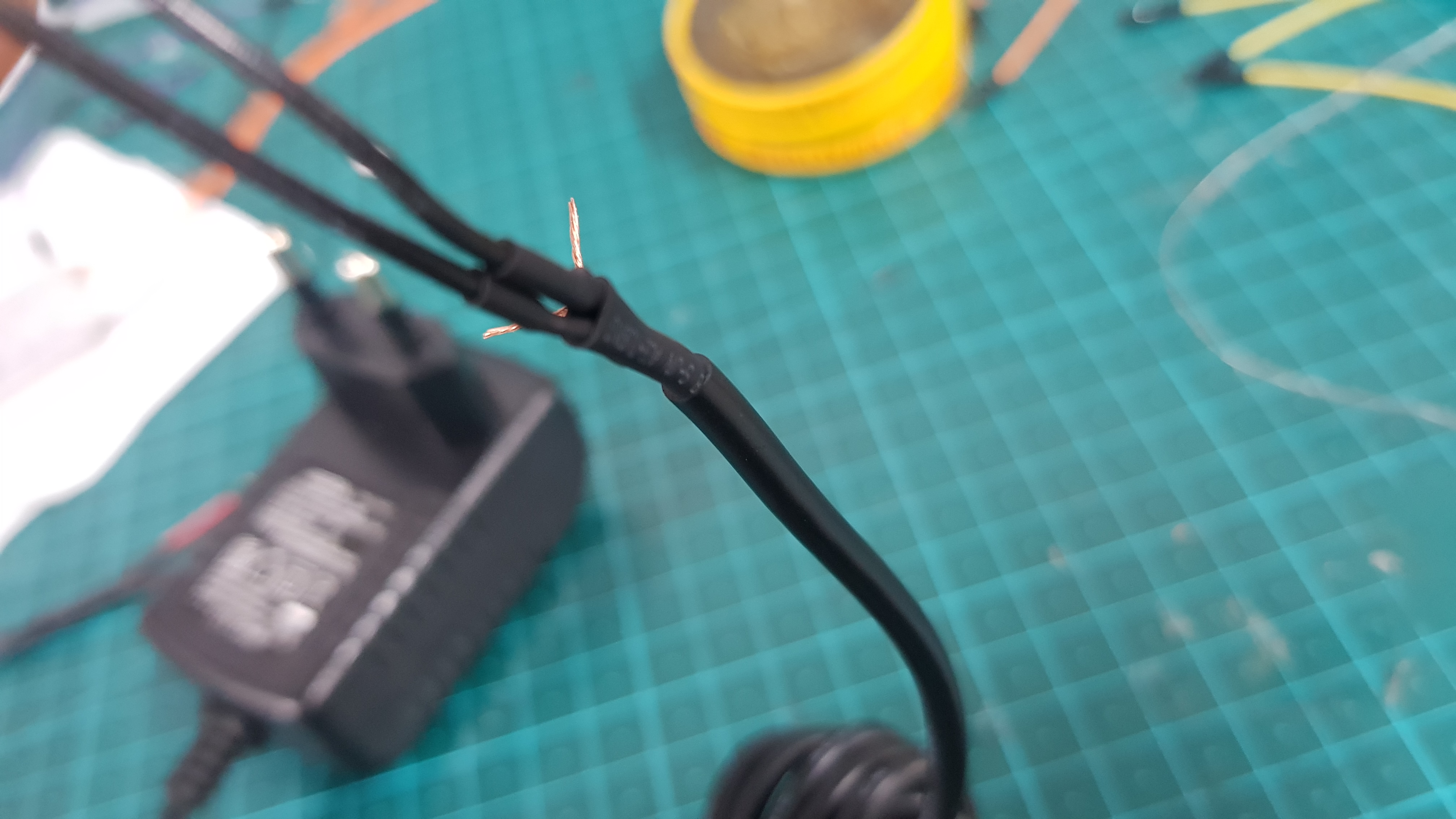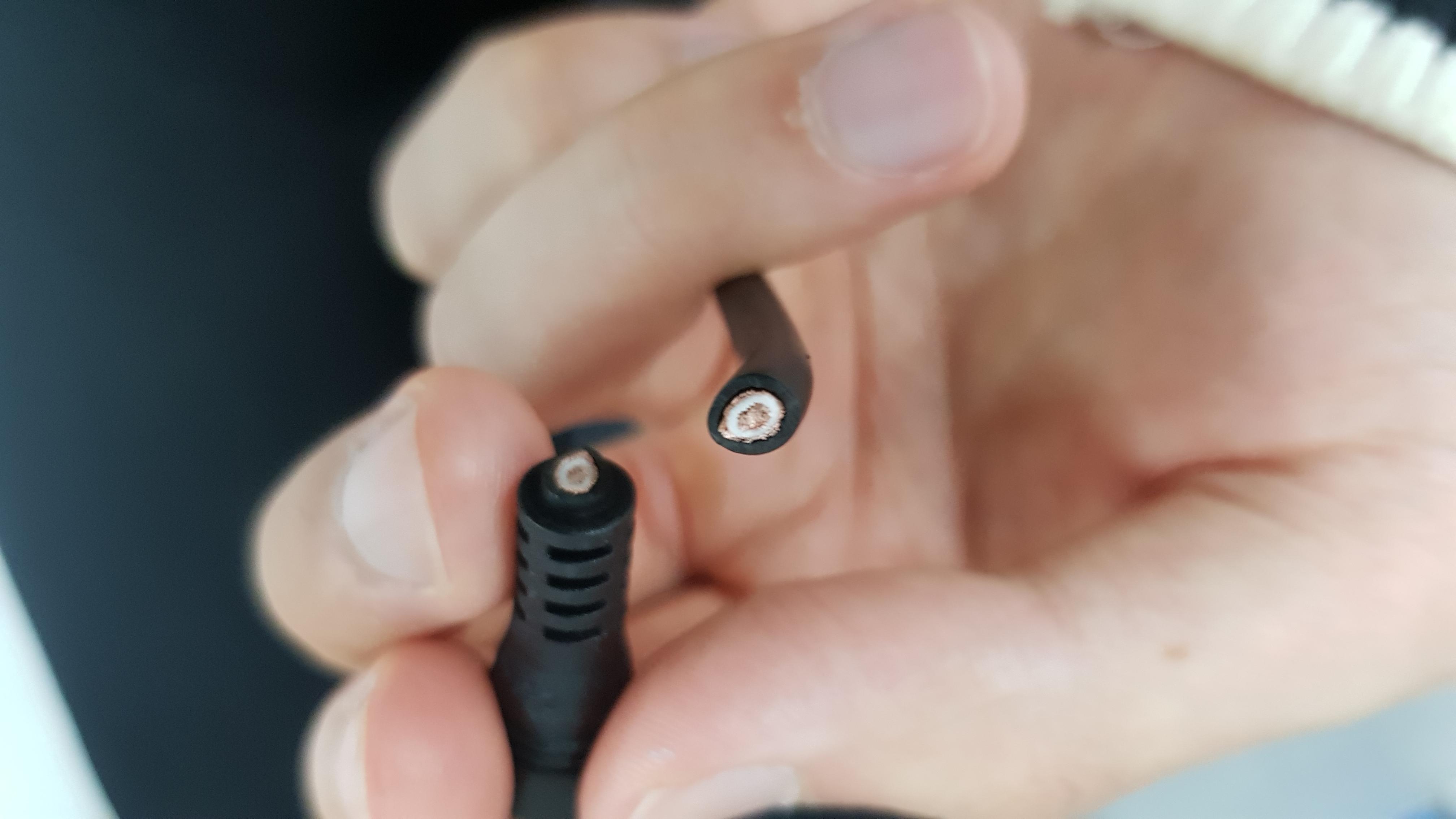 Barrel jack을 잘라내면, 고전압 고전류 어댑터의 경우는 사진과 같이 하얀고무재질 안에 한 묶음의 전선, 그 주위로 다른 묶음의 전선이 있는 것으로 보입니다.