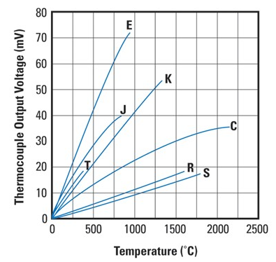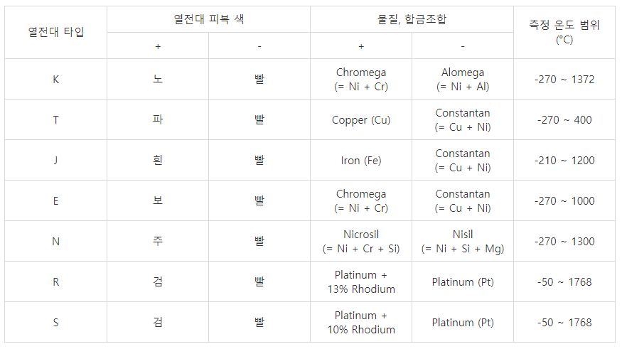 열전대는 다양한 타입(종류)별로 사용 물질과, 그에 따른 측정 온도와 오차가 다릅니다.