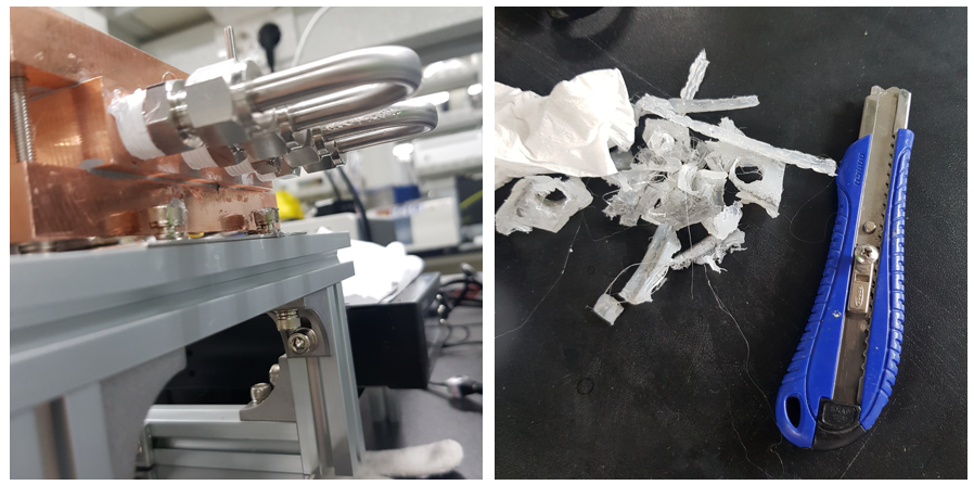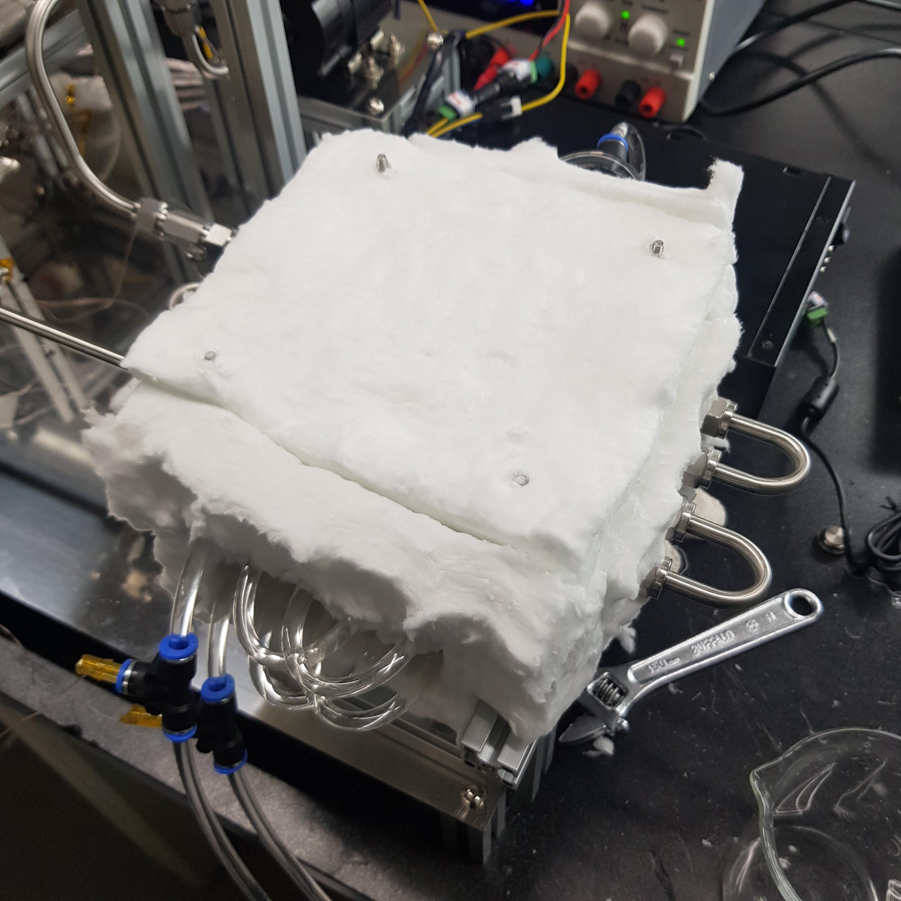 ++ 상온보다 찬 유체를 냉각수로써 흘려주기에, 두께 5cm 정도의 유리섬유로 Insulating 해주었습니다 :)
