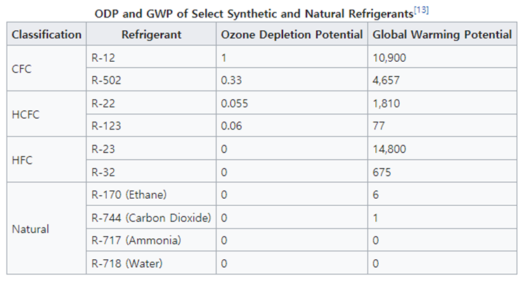 - 현재는 GWP가 10미만인 HFO냉매 혹은 자연냉매(CO2 등)로 전환되는 추세 & 건물용 및 상업용 냉동기에 사용되는 냉매들에 대한 Low GWP 대체 냉매들이 개발돼 일부 적용되고 있다.