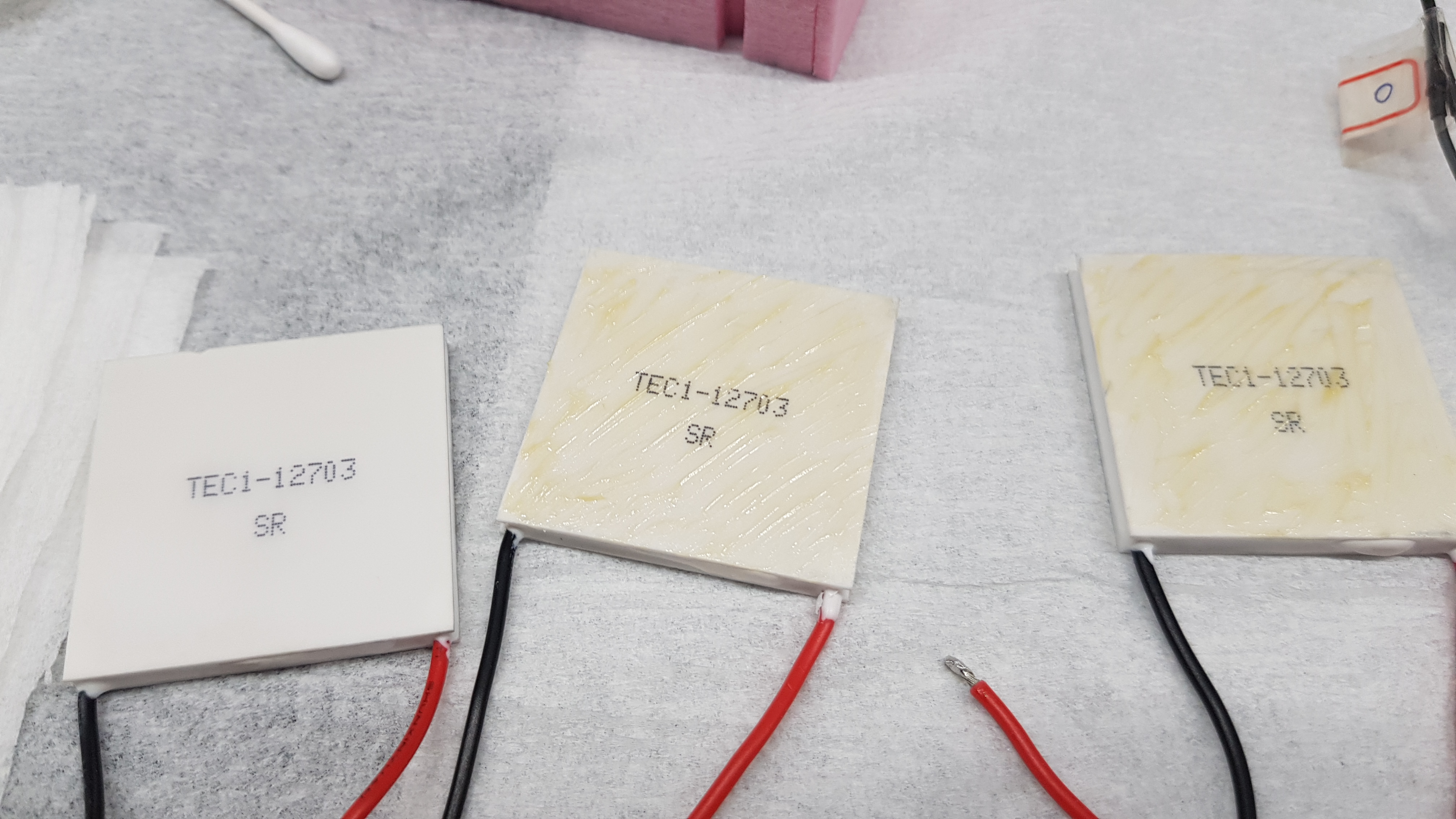 그래서 위와같은 위치에 삽입 (펠티어모듈 사이에 약간의 공간 & 워터블럭과 펠티어모듈 사이가 아닌 워터블럭과 핑크보드 사이)