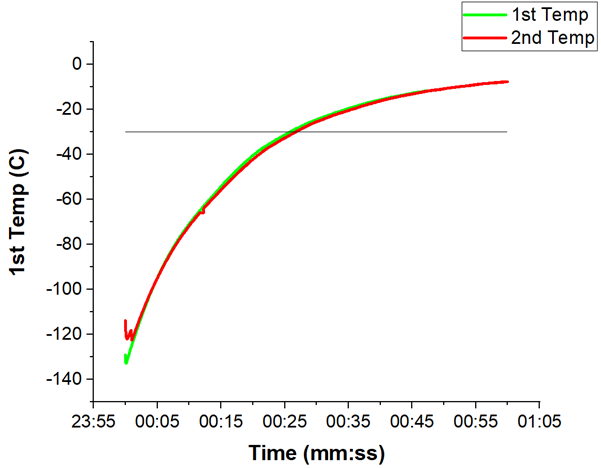 핑크보드(스티로폼) 속에 넣어 단열하는 과정에서 얼마나 빠른 열 손실, 온도 상승이 일어나는지 보인 그래프이다.
