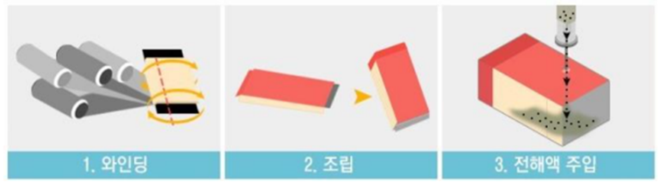 - 와인딩(winding) = 양극, 분리막, 음극을 겹쳐서 돌돌 말아주는 과정 ~ 말린 것 = 젤리롤