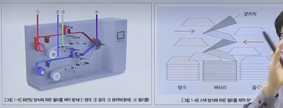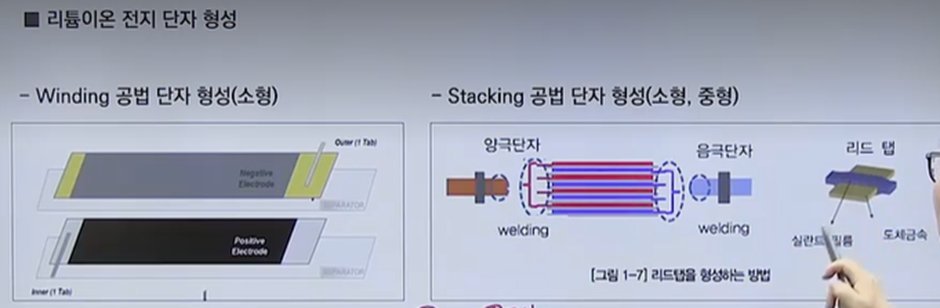 - 젤리롤제작: 와인딩(필요한 만큼, 길이 잘라 말아) 스택(잘라서 스택킹)