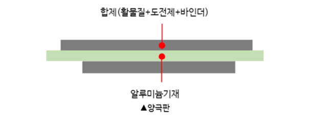 - 양극판은 알루미늄 집전체로 된 기재, 음극판은 구리 집전체로 된 기재를 사용