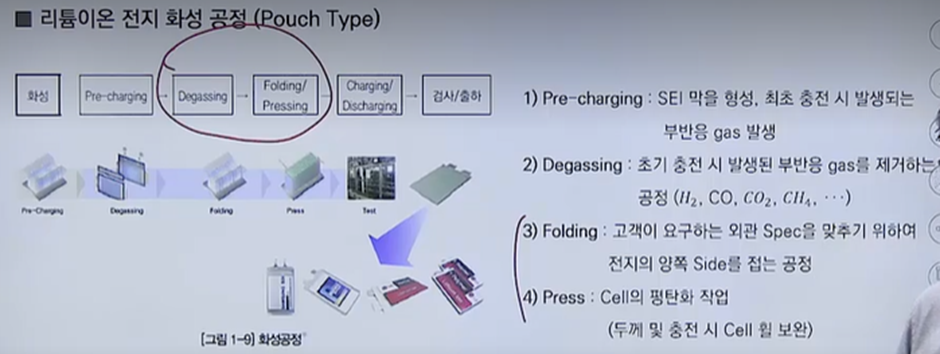 - Precharging: 음극 표면에 SEI 막(초기 충/방전이 잘 이뤄지기 위해)을 만들기 위해 전해액의 분해가 일어나며 이때 가스 발생