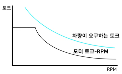 그렇기에 모터는 엔진처럼 변속기의 여러 단으로 차량의 요구 토크선도를 맞춰줄 필욕가 없고,
