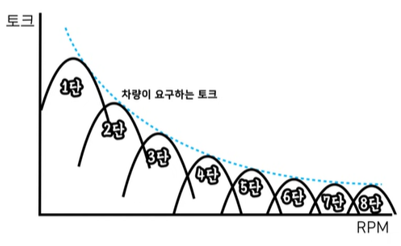 구간을 나누어 최대한 차량이 요구하는 토크에 맞게끔 조율해주는 것이 변속기이고