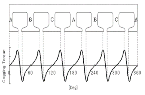 - 이 토크는 한 주기 동안 돌렸을 때, 기여하는 평균 토크가 0인 토크 (순간 토크는 있으나 최종적으로 회전에 기여하는 토크 없음) = 고정자의 요철 구조와 상호작용으로 플러스 마이너스가 교번하는 토크