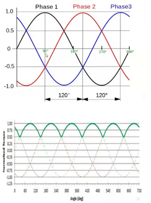 정현파 전략: 전동기의 역기전력과 입력전류를 정현파로 만들어 시간에 대한 전기적 입력을 일정하게 만드는 전략 ~ 여러 상의 정현파를 조합해 일정한 토크가 형성되게 디자인