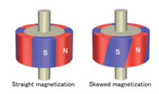 스큐착자: 적층 방향으로 수직이 아니고 비스듬하게 착자하는 방식 = 코깅토크 저감 설계 및 토크리플 조절 용이