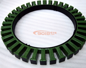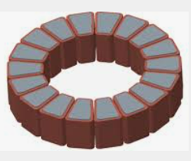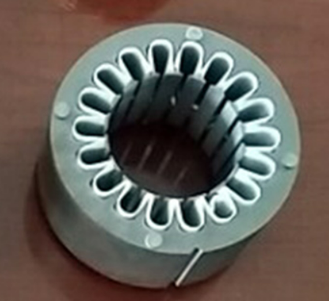 (원통, 전체 단면에 맞는 강판을 쌓아 고정자를 만드는 것이 아닌, 치 부분만큼의 고정자 파트들을 만들고 이들을 둥그렇게 이어 전기모터 고정자를 구성한다)