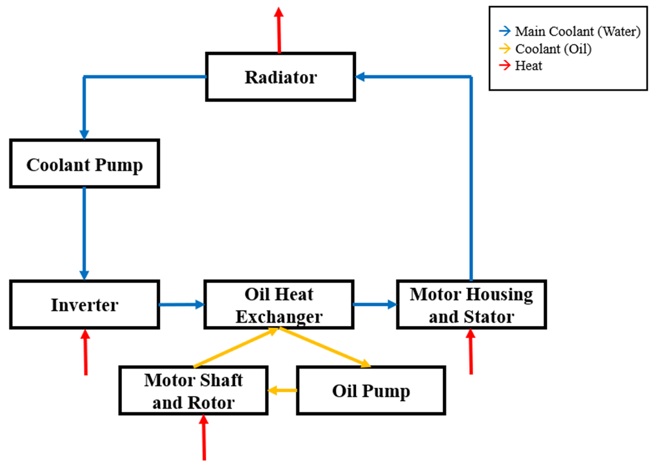 2. 모터/감속기, 오일쿨러(oil cooler - heat exchanger), 오일 펌프(oil pump)로 구성된 구동계 열관리 파트