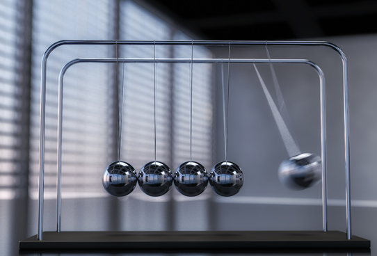 진자운동에서도 붙어있는 진자간의 힘에너지, 일에너지의 전달로 반대편의 진자에 속도 및 위치를 주게 됩니다.