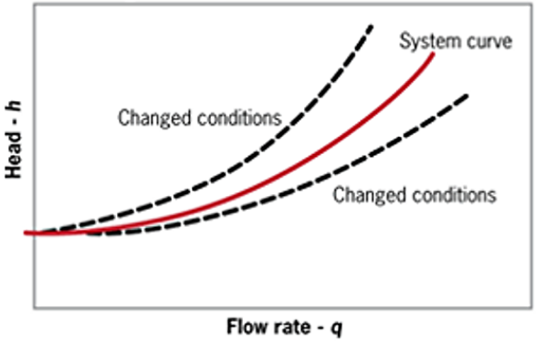 펌프는 저 시스템곡선과 펌프 성능곡선의 교차점인 작동점(operating point)에 맞는 (x, y 값)
