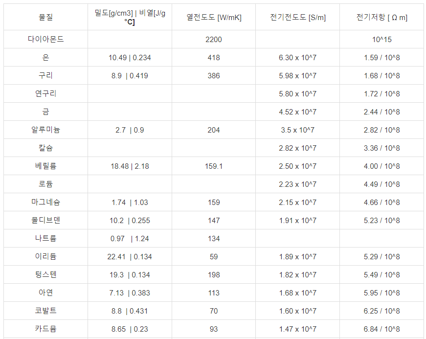 | 물질 | 밀도[g/cm3] | 비열[J/g °C] | 열전도도 [W/mK] | 전기전도도 [S/m] | 전기저항 [ Ω m] |