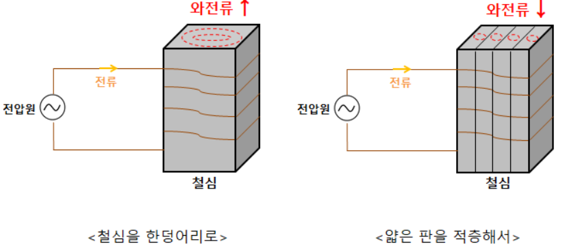 철판을 층층히 쌓으며 와류손 발생에서의 도체 두께를 최소화 하는 방법을 택했다.