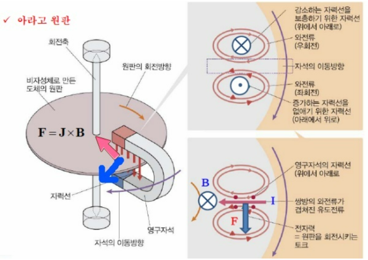 위 사진은 유도모터의 원리로, 알루미늄(비자성체) 같은 자기장에 반응하는 소재를 회전체로 두고