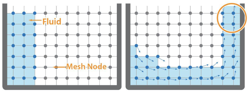 입자를 두고, 입자와 주변 입자와의 상호작용을 계산한다. 그 계산을 넓혀가며 전체 흐름을 계산한다.
