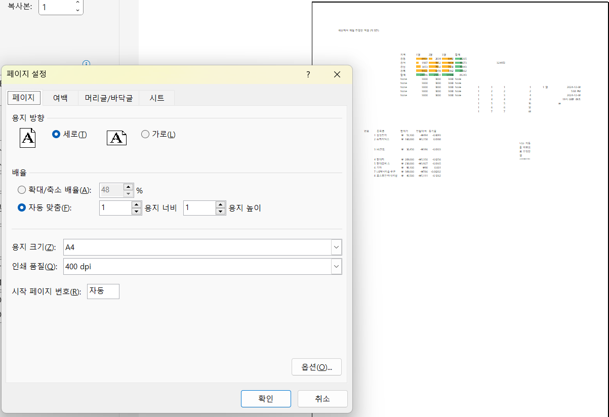 현재는 100% => 48% 배율이 자동 조절되며 모든 글 써진 셀이 한 페이지에 우겨 넣어집니다