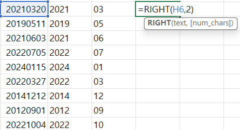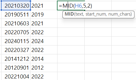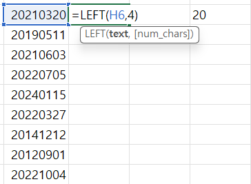 H6 셀의 왼편부터 4개 가져오기 = 연도