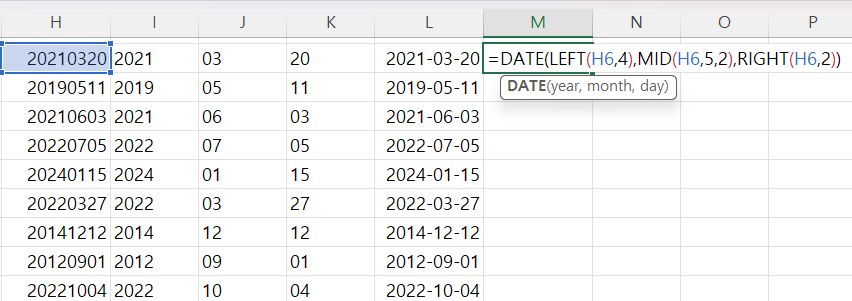 20250104 처럼 연월일을 합쳐 놓은 데이터를 나누는 함수 및 기능