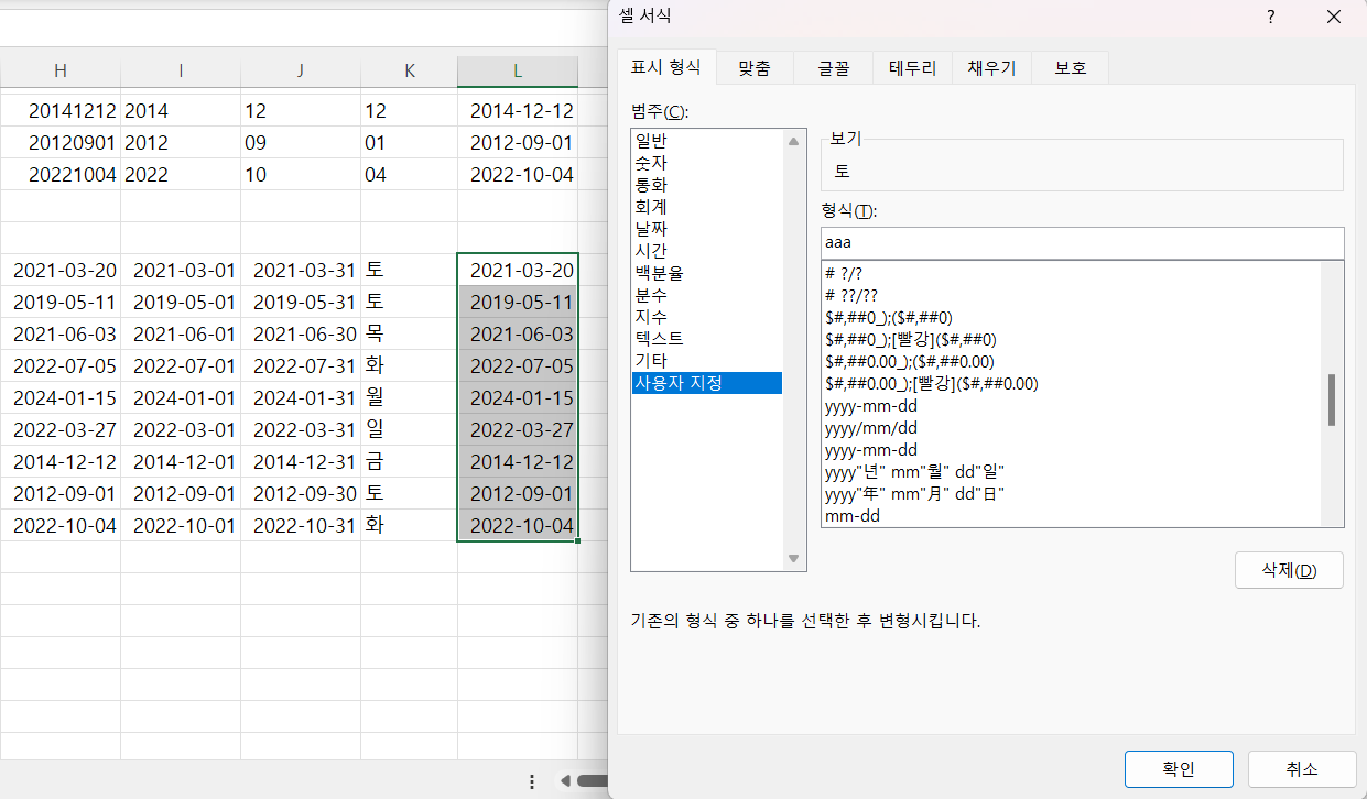 날짜 값을 셀 서식을 통해