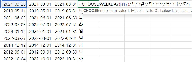 CHOOSE 함수와 WEEKDAY 함수를 통해 요일 자동화 가능합ㄴ디ㅏ