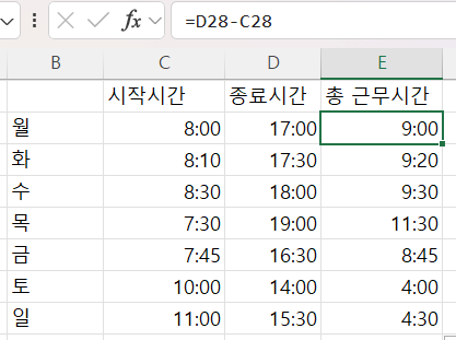 간단히 시작시간과 종료시간의 총 근무 시간 구하기는