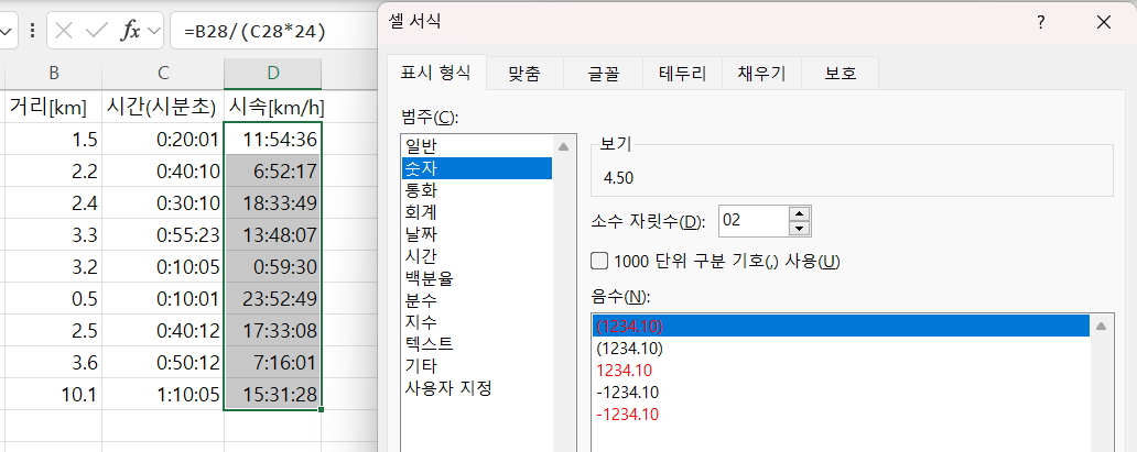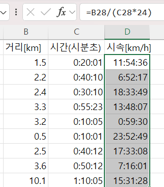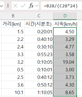 시속 [km/h] 계산이나
