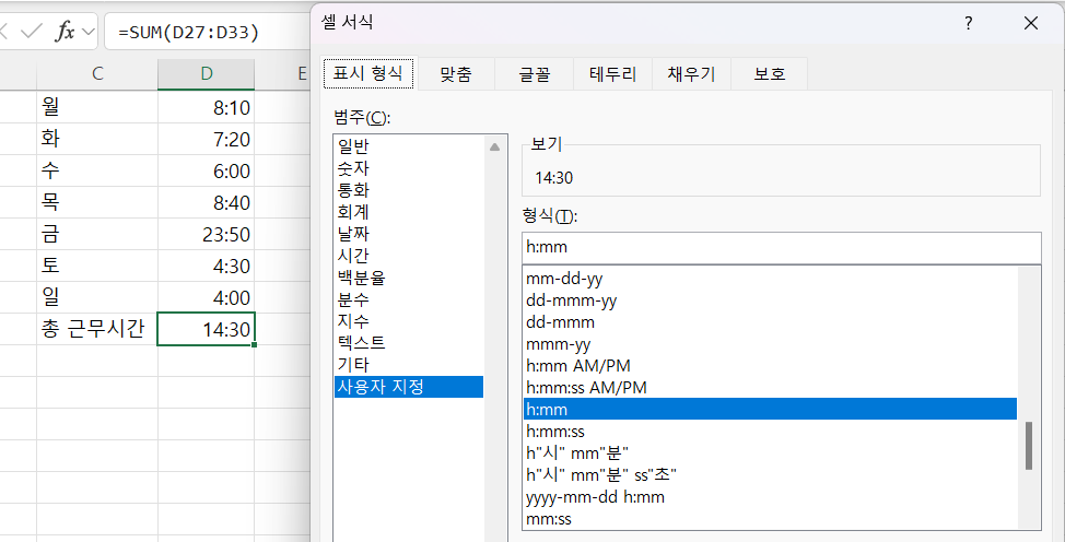 형식이 h:mm 을 놓는다면