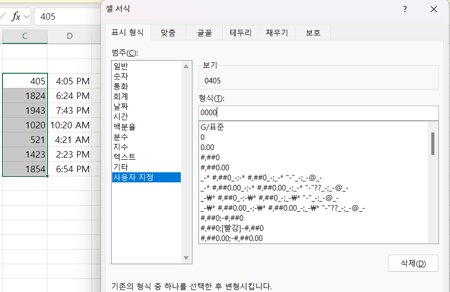 0000 사용자지정 형식을 넣어주면 4:05 AM으로 올바르게 읽힌다는 것인데..