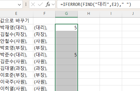 대리가 있을 때는 Find에서 나타낸 값 (대리라는 글자는 확인 셀의 5번째에 위치한다)이 나오고