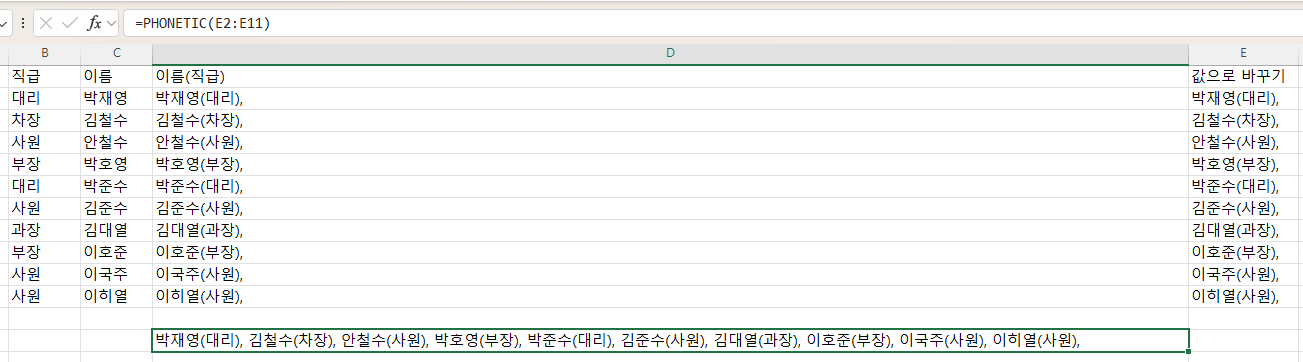그냥 사람들의 이름과 직급이 , 를 사이에 두고 연결되었으면 합니다.