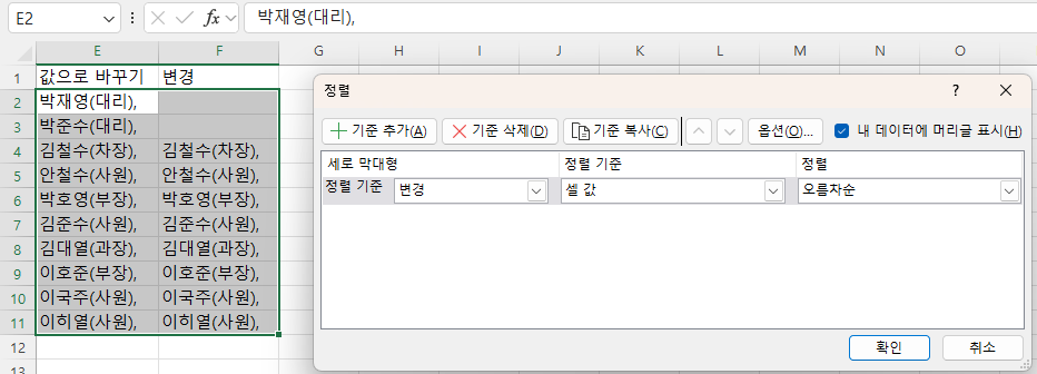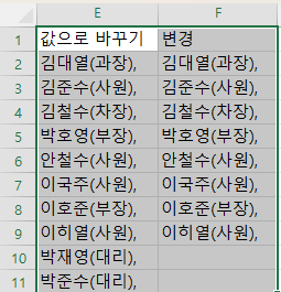 다시 E,F열 + 1~11행을 전부 선택 후