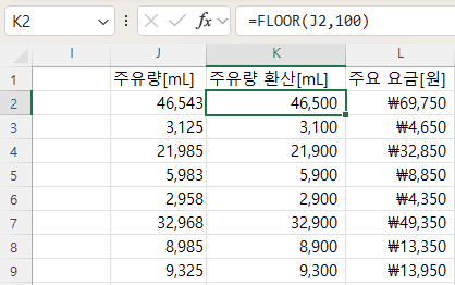 이는 위에서 사용한 RoundDown(숫자,-2) 느낌으로 사용해주어도 동일하게 되겠습니다.