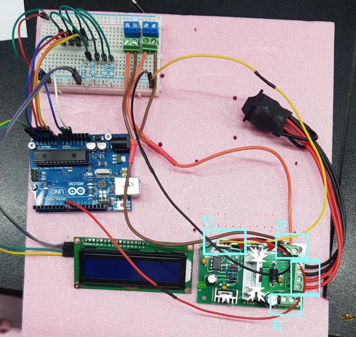 2) 모터 혹은 파워를 컨트롤할 제품(여기서는 팰티어)에 연결한 +, - 배선이 있으며